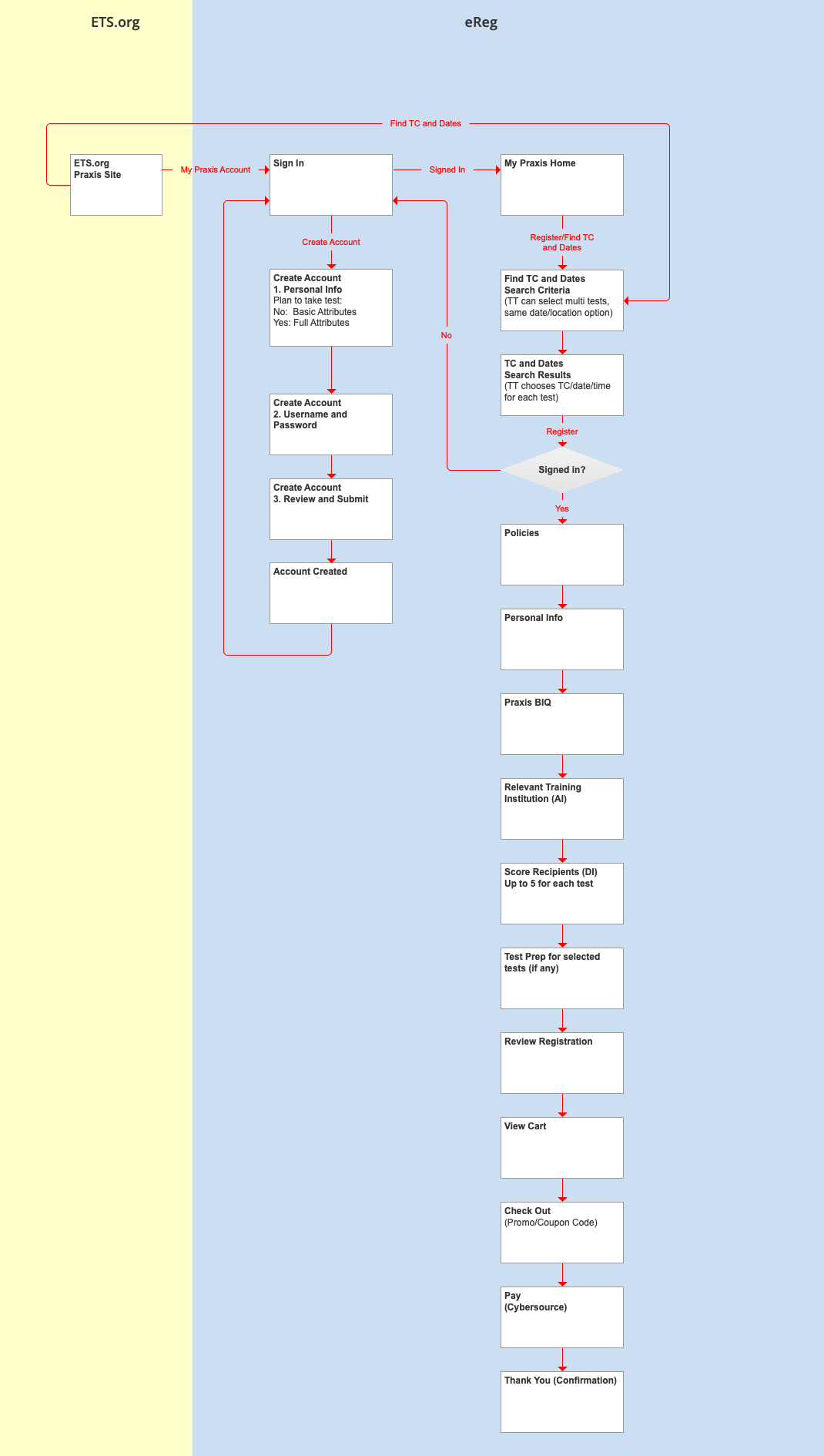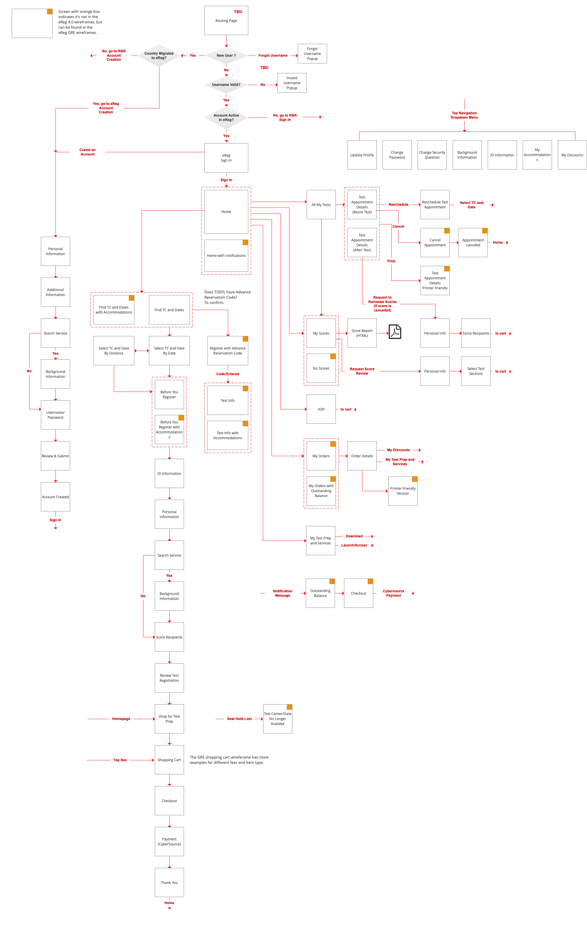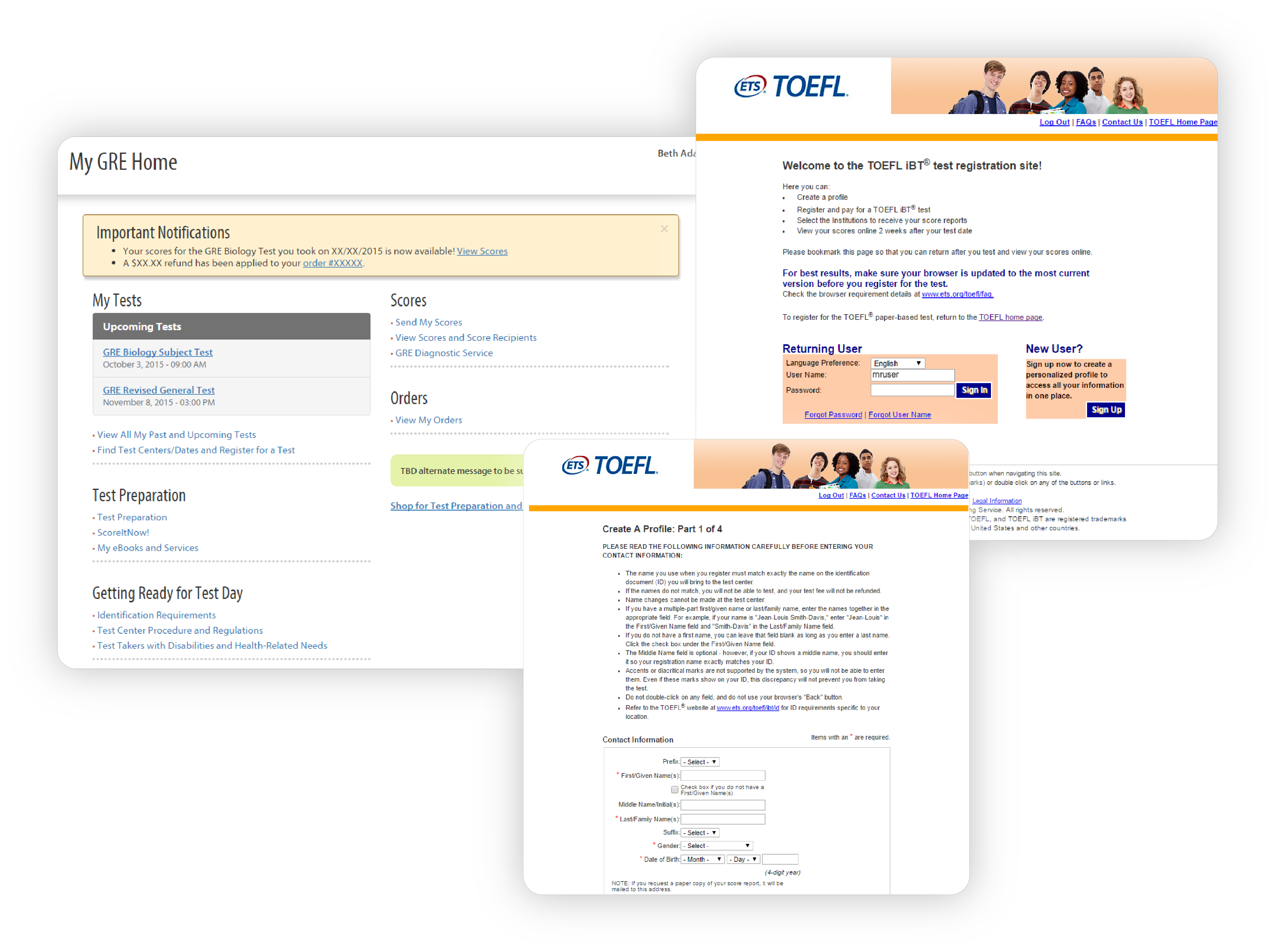 The redesign for the registration system is based on the following products: GRE, TOEFL, PRAXIS, and HiSet. We performed round 1 usability testing (pre-design) for GRE and did extensive research for all registration systems. The TOEFL exam has large international user base, which made it the most complex. To initiate the process we started redesigning the TOEFL Registration system. The redesign will lead to the other products upon completion. This will then allow the goal for”MY ETS” to launch where users can use one login for all products under the ETS umbrella.