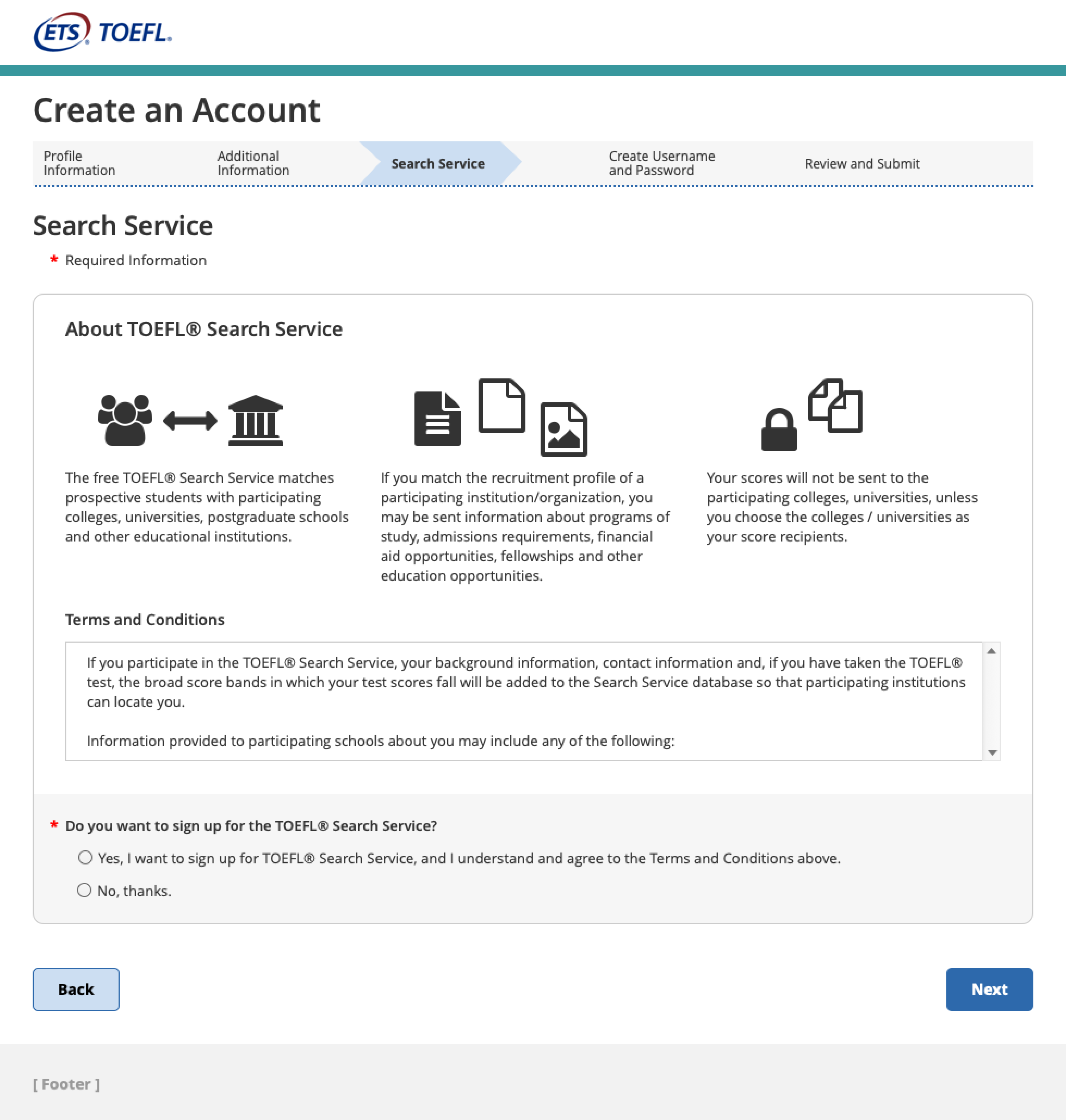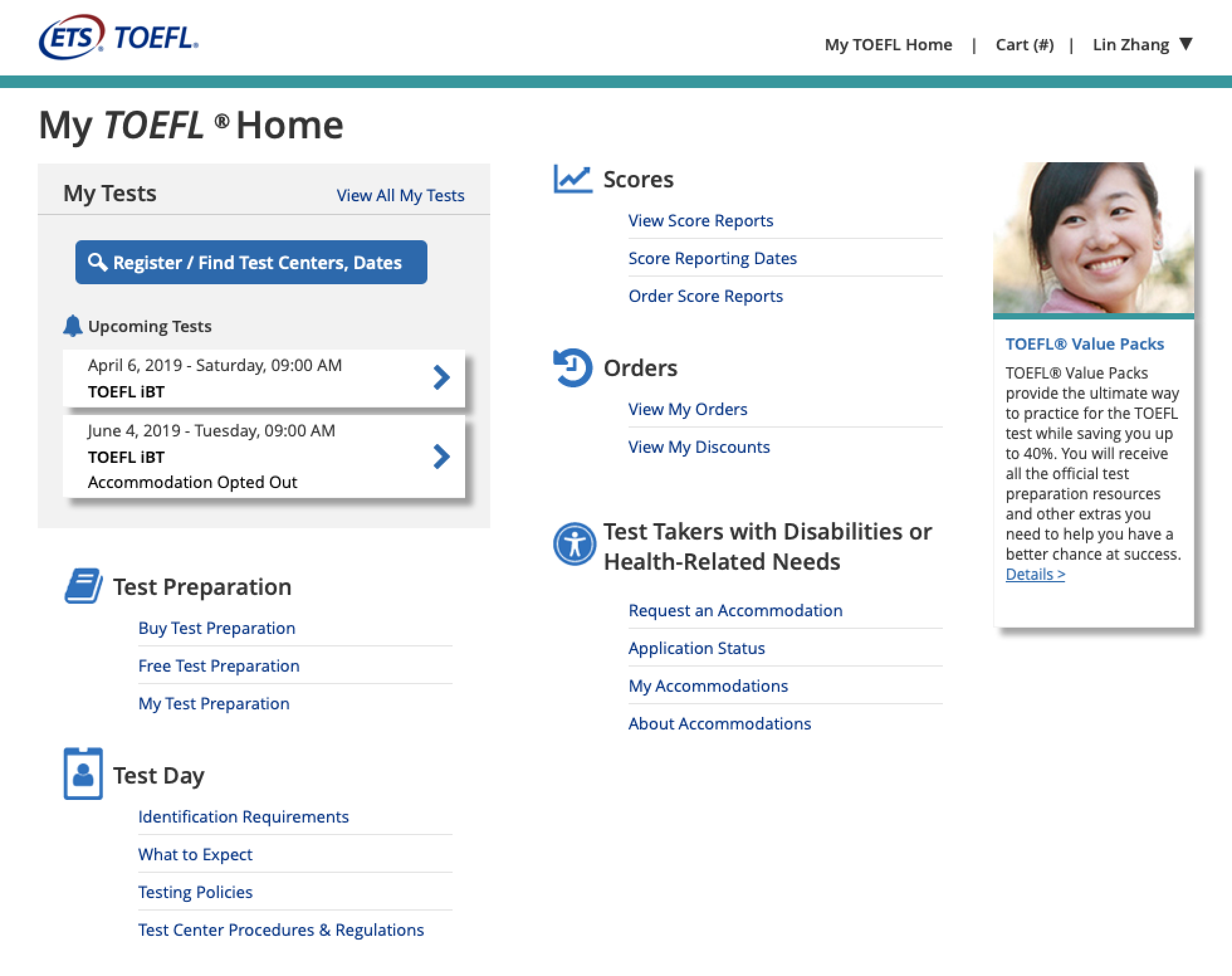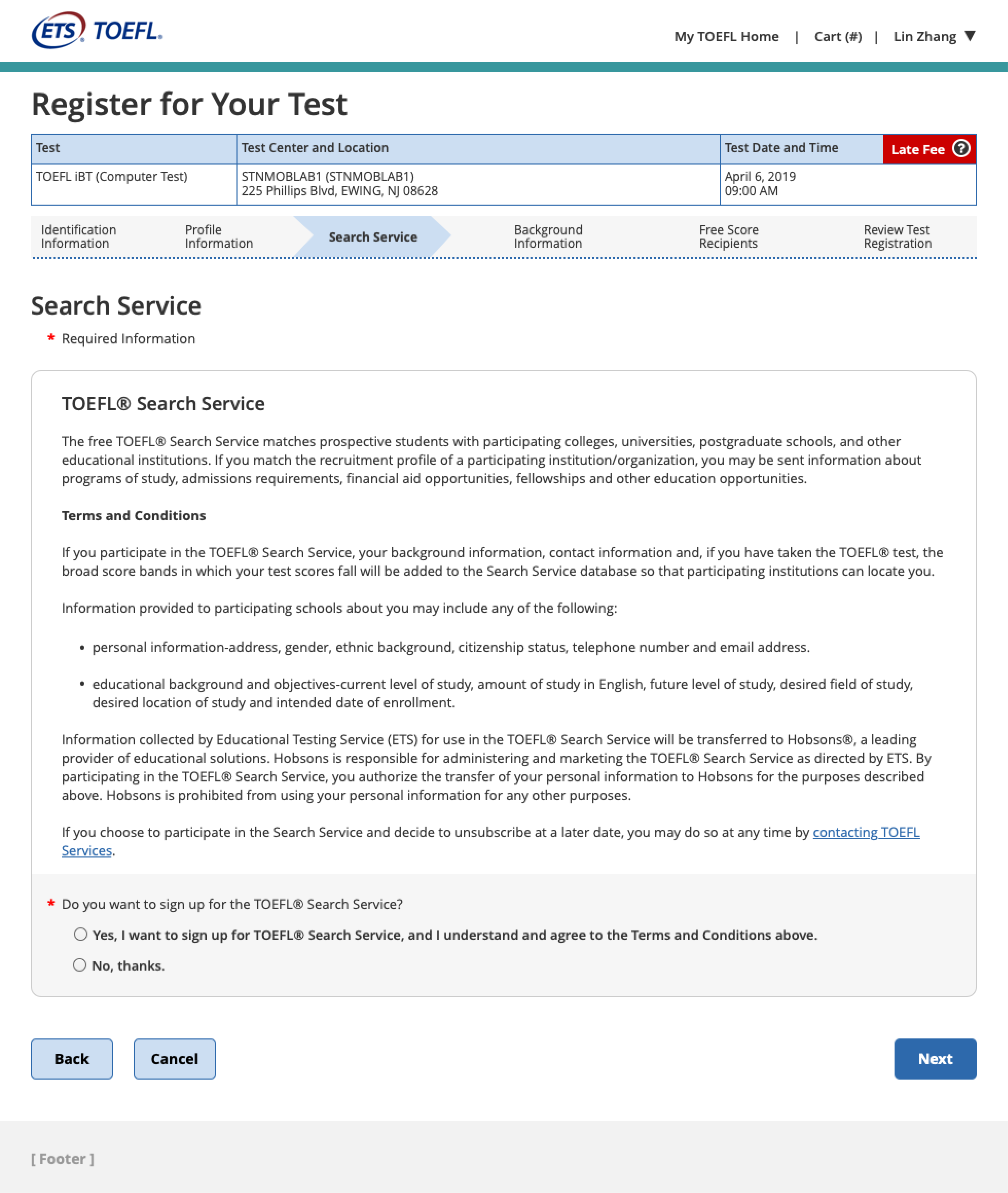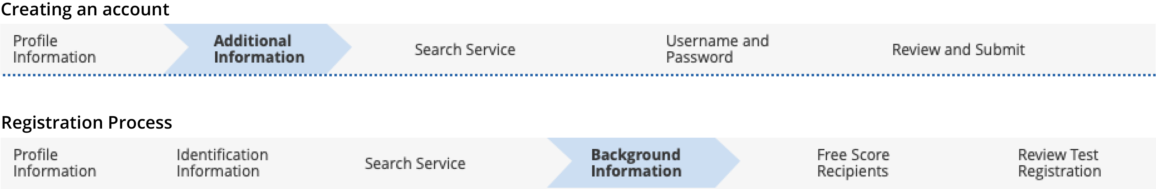 The redesign for the registration system is based on the following products: GRE, TOEFL, PRAXIS, and HiSet. We performed round 1 usability testing (pre-design) for GRE and did extensive research for all registration systems. The TOEFL exam has large international user base, which made it the most complex. To initiate the process we started redesigning the TOEFL Registration system. The redesign will lead to the other products upon completion. This will then allow the goal for”MY ETS” to launch where users can use one login for all products under the ETS umbrella.