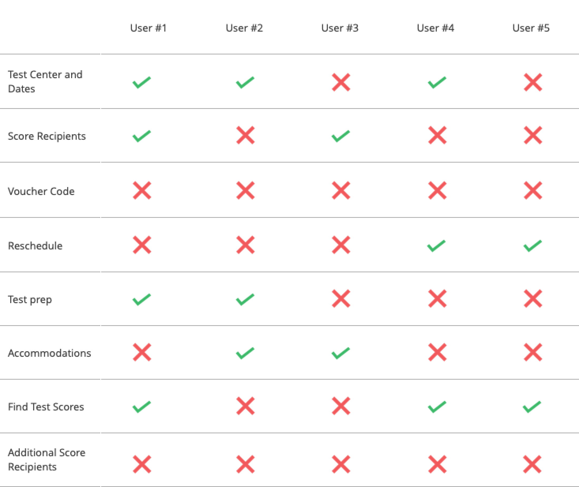 Even though each component has been tested for usability, I wanted to make sure the full onboarding experience worked and made sense. I conducted a full usability test with 7 people. 3 of them had done the test before (to see if the improvements helped them). During the session all test takers were asked to do several tasks related to registering online for a test, making changes to their appointments and accounts and viewing their scores.