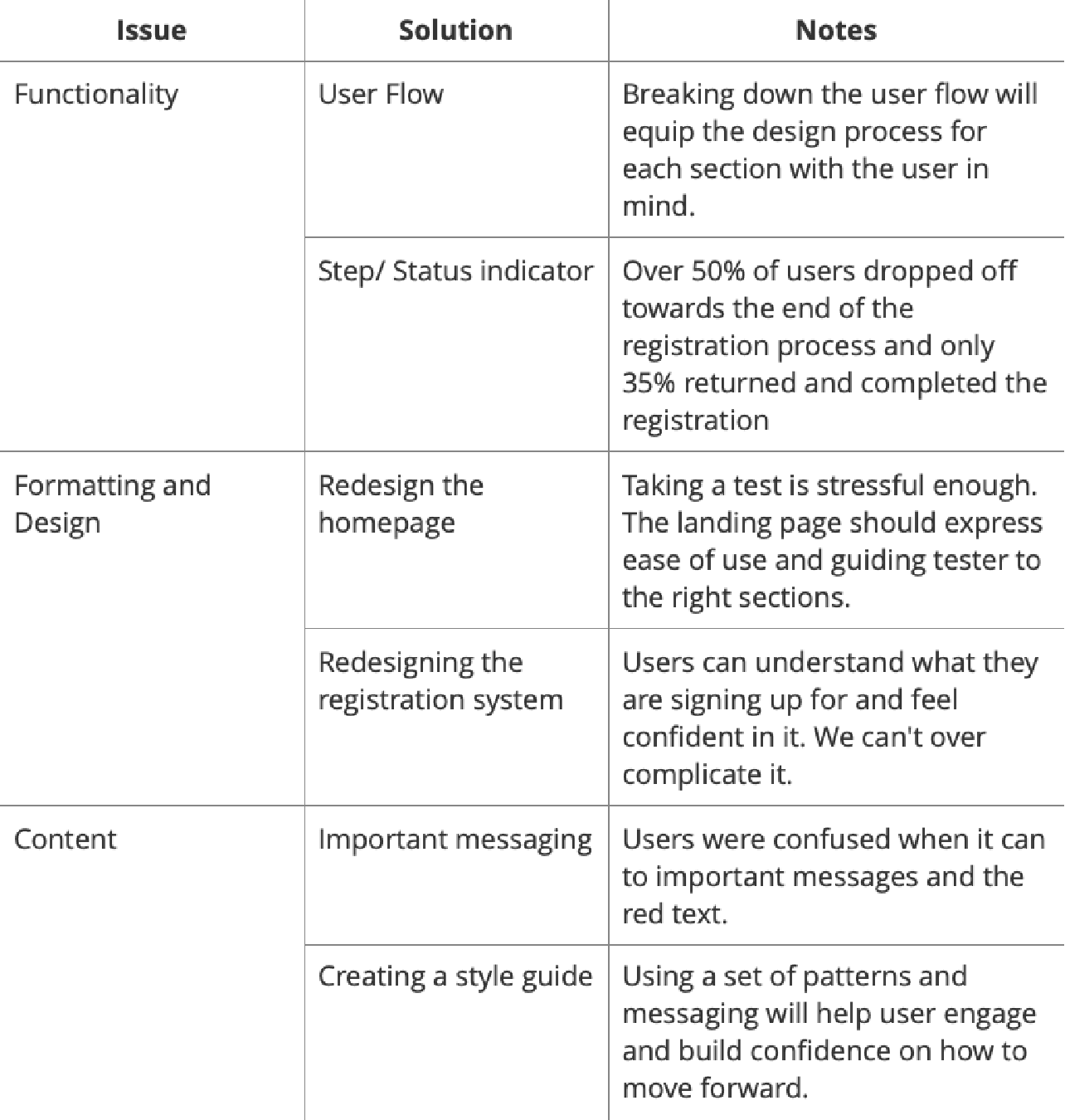 Based on the usability test and follow-up interviews, there were the many pressing issues that needed to be addressed throughout the registration system. I narrowed down each issue into a category.